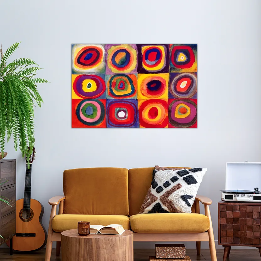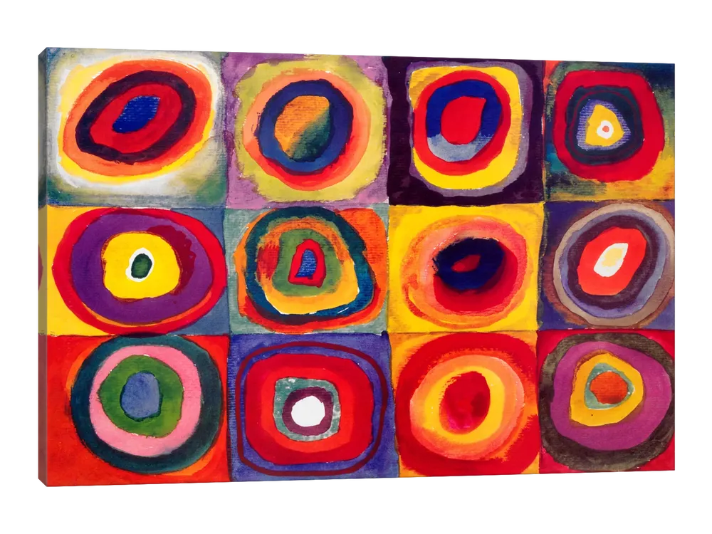 اللوحة عبارة عن شبكة (Grid) مكونة من اثني عشر مربعًا. داخل كل مربع من هذه المربعات، يوجد تصميم مستقل من الدوائر الملونة التي تشترك جميعها في نفس النقطة المركزية.